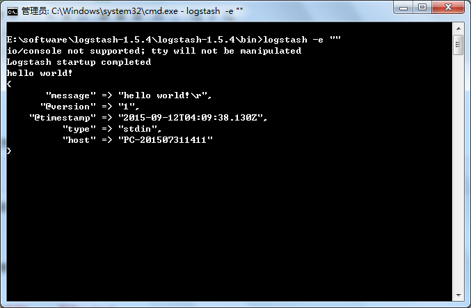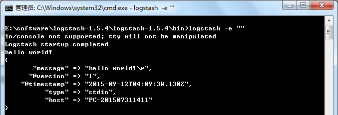 Ok,还挺有意思的吧... 以上例子我们在运行logstash中,定义了一个叫"stdin"的input还有一个"stdout"的output,无论我们输入什么字符,Logstash都会按照某种格式来返回我们输入的字符。这里注意我们在命令行中使用了 -e 参数,该参数允许Logstash直接通过命令行接受设置。这点尤其快速的帮助我们反复的测试配置是否正确而不用写配置文件。
