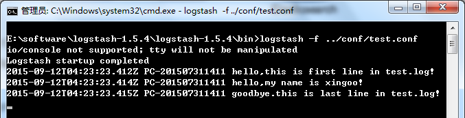 bin/logstash -f logstash-simple.conf我们看到logstash按照你刚刚创建的配置文件来运行例子,这样更加的方便。注意,我们使用-f参数来从文件获取而代替之前使用-e参数从命令行中获取配置。以上演示非常简单的例子,当然解析来我们继续写一些复杂一些的例子。