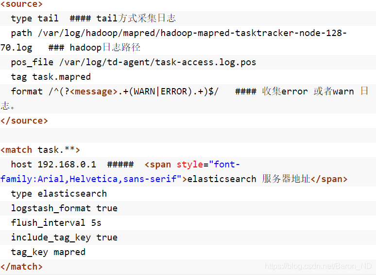 <source> type tail #### tail方式采集日志 path /var/log/hadoop/mapred/hadoop-mapred-tasktracker-node-128-70.log ### hadoop日志路径 pos_file /var/log/td-agent/task-access.log.pos tag task.mapred format /^(?<message>.+(WARN|ERROR).+)$/ #### 收集error 或者warn 日志。 </source> <match task.**> host 192.168.0.1 ##### <span style="font-family:Arial,Helvetica,sans-serif">elasticsearch 服务器地址</span> type elasticsearch logstash_format true flush_interval 5s include_tag_key true tag_key mapred </match>