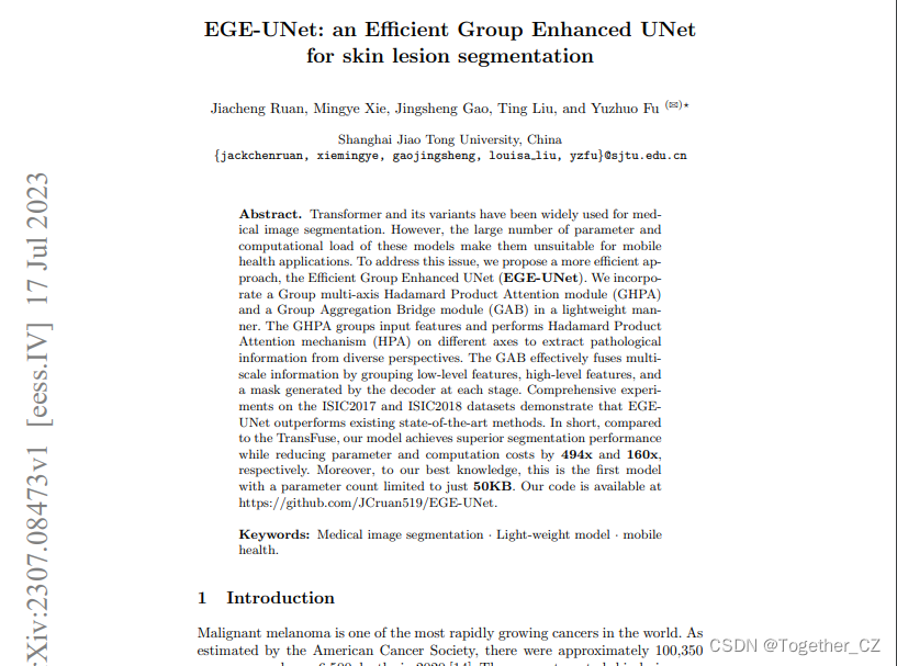 今天看到一篇挺有意思的文章,做的是跟医疗图像分割相关的工作,但是不像之前看到的一些工作一味地去追求高精度,因为医疗领域本身就是一个相对特殊的行业,对于模型产生的结果的精确性要求是很高的,带来的是参数量级的庞大,之所以觉得这篇论文挺有意思的就是因为这里的主要的点在于超轻量级但是并没有导致精度大幅下降。