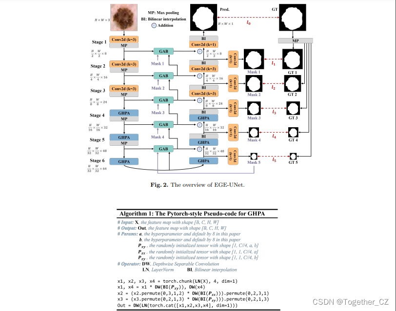 EGE-UNet的设计沿用了 U 形架构,包括对称的编码器-解码器部分。编码器由六个 stage 组成,各阶段的通道数量为{8, 16, 24, 32, 48, 64}。前三个阶段采用了普通卷积,而后三个阶段使用提出的 GHPA 来从多视角提取表征信息。