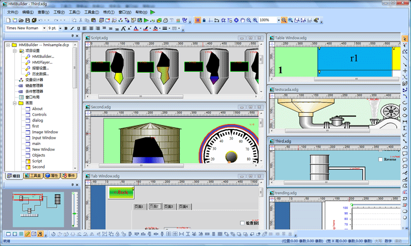 高级HMIBuilder解决方案,提供开发工控与仿真应用的必不可少的集成解决方案,容画面制作,变量设定,脚本编辑,编译运行 ,权限管理于一体,具有数十项工控与仿真应用必须具备的高难度技术,可为开发该型应用节省多达80%-90%的工作量,该解决方案该解决方案包含如下几个方面的高级功能: