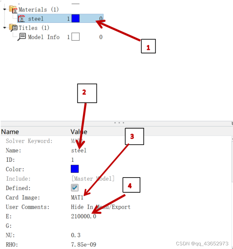 4.4给材料参数:E弹性模量、Nu泊松比、RHO密度。