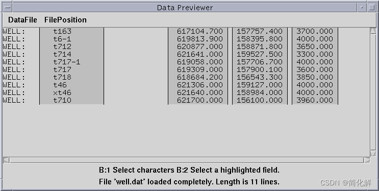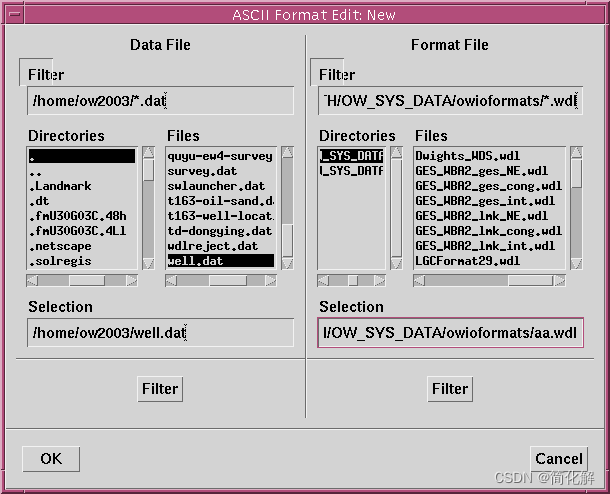 在数据文件处输入井文件的目录及文件名home/ow2003/well.dat,在格式文件中输入格式文件的要存的目录及文件名/aa.wdl,然后OK(图3),会出现数据well.dat的窗口(图5)。