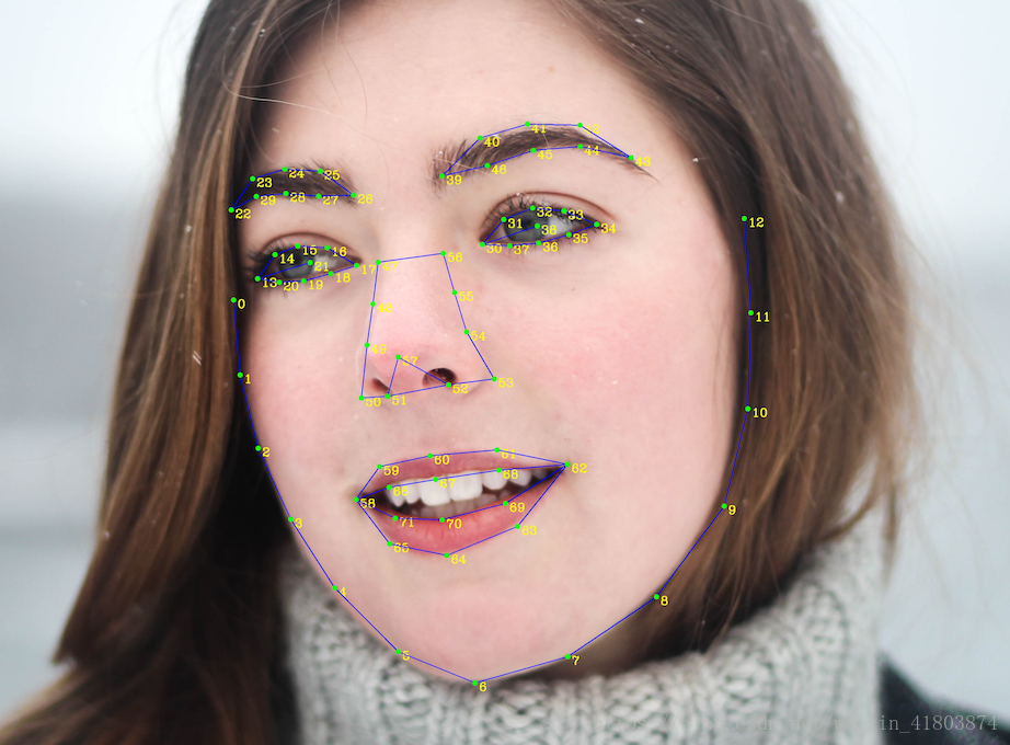 # 返回结果结构 "face_num": 1,"error_msg" : 'SUCCESS'"error_code" : 0"result" :{ "face_list": [ { "face_token": "35235asfas21421fakghktyfdgh68bio", "location": { "left": 117, "top": 131, "width": 172, "height": 170, "ro tation": 4 }, "face_probability": 1, "angle" :{ "yaw" : -0.34859421849251 "pitch" 1.9135693311691 "roll" :2.3033397197723 } "landmark": [ { "x": 161.74819946289, "y": 163.30244445801 }, ... ], "landmark72": [ { "x": 115.86531066895, "y": 170.0546875 }, ... ], "age": 29.298097610474, "beauty": 55.128883361816, "expression": { "type": "smile", "probability" : 0.5543018579483 }, "gender": { "type": "male", "probability": 0.99979132413864 }, "glasses": { "type": "sun", "probability": 0.99999964237213 }, "race": { "type": "yellow", "probability": 0.99999976158142 }, "face_shape": { "type": "triangle", "probability": 0.5543018579483 } "quality": { "occlusion": { "left_eye": 0, "right_eye": 0, "nose": 0, "mouth": 0, "left_cheek": 0.0064102564938366, "right_cheek": 0.0057411273010075, "chin": 0 }, "blur": 1.1886881756684e-10, "illumination": 141, "completeness": 1 } } ]}六:特征点图像