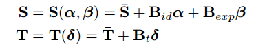 上式的alpha, beta为人脸的identical 和表情系数,这篇论文的identical和颜色参考的是BFM模型,只取了前80维数据(原始维度为199),而表情部分的系数则参考了Face Warehouse数据集给出的前64维。
