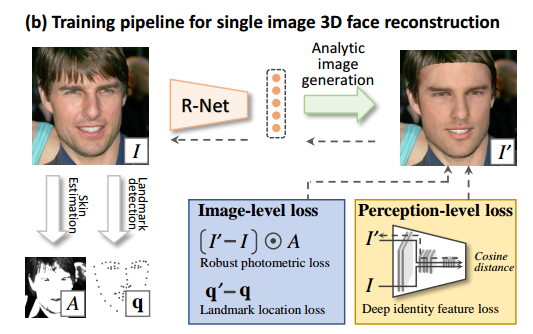 由于我们可以通过上面说的人脸模型参数,光照模型参数以及相机模型参数,那么我们就可以用计算机图形学的知识将3d人脸投影到相平面上(上图的I’),最后通过多种loss共同约束网络的训练。