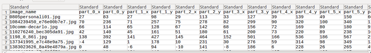 打开csv文件可以看到该文档以表格的形式保存着所有图片的文件名和对应关键点的坐标。