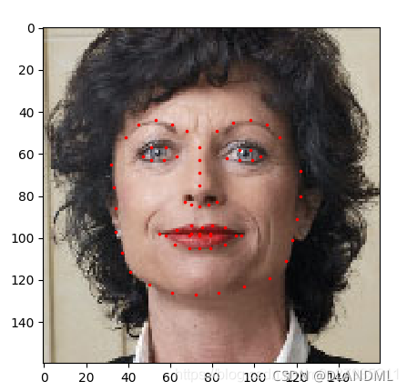 #--coding:utf-8--import osimport pandas as pdfrom skimage import ioimport matplotlib.pyplot as plt #用pandas库读取csv文件landmarks_frame = pd.read_csv('data/faces/face_landmarks.csv') n = 65#行号img_name = landmarks_frame.iloc[n, 0]landmarks = landmarks_frame.iloc[n, 1:].as_matrix()landmarks = landmarks.astype('float').reshape(-1, 2) print('Image name: {}'.format(img_name))print('Landmarks shape: {}'.format(landmarks.shape))print('First 4 Landmarks: {}'.format(landmarks[:4])) def show_landmarks(image, landmarks): """Show image with landmarks""" plt.imshow(image) plt.scatter(landmarks[:, 0], landmarks[:, 1], s=10, marker='.', c='r') plt.figure()show_landmarks(io.imread(os.path.join('data/faces/', img_name)), landmarks)plt.show()运行结果: