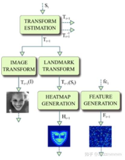 从第一阶段开始讲起,第一阶段的输入仅有原始图片和 S0。面部关键点的初始化即为 S0,S0 是由所有关键点取平均得到,第一阶段输出 S1。对于第二阶段,首先,S1 经第一阶段的 CONNECTION LAYERS 进行转换,分别得到转换后图片 T2(I)、S1 所对应的热图 H2 和第一阶段 fc1 层输出,这三个正是第二阶段的输入。如此周而复始,直到最后一个阶段输出 SN。文中给出在数据集 IBUG 上,经过第一阶段后的 T2(I)、T2(S1)和特征图,如图所示: