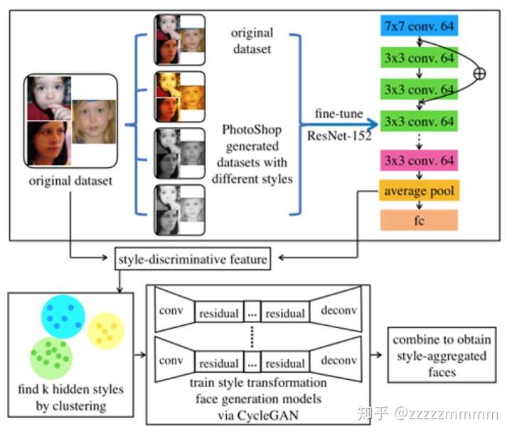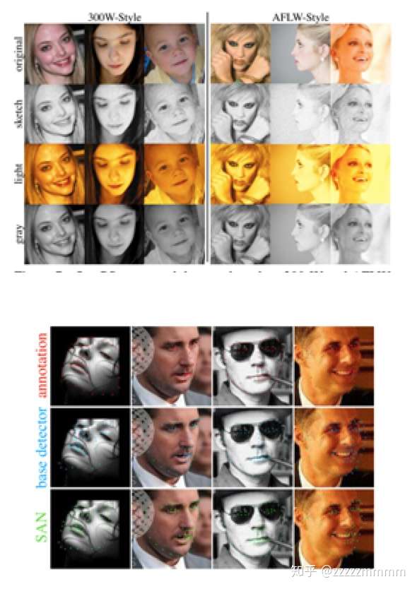 这篇文章主要聚焦在对于不同style的图像中,人脸关键点的检测效果是不一样的,为了更好地统一检测效果或者说为了更好地更精确的提高检测效果,因此可以对样本进行一个风格聚合网络Style Aggregated Network,通过该网络模型可以产生各种不同风格的图片,然后利用这些图片融合信息一起送入CNN网络中进行检测。如下图所示,根据上面的描述,这里使用到了两个网络模型,一个是GAN网络模型,一个是CNN网络模型。