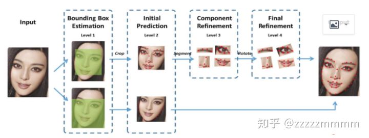 Face++版 DCNN 首次利用卷积神经网络进行 68 个人脸关键点检测,针对以往人脸关键点检测受人脸检测器影响的问题,作者设计 Level-1 卷积神经网络进一步提取人脸边界框,为人脸关键点检测获得更为准确的人脸位置信息,最终在当年 300-W 挑战赛上获得领先成绩。