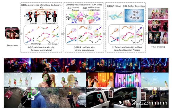 为了解决在视频流中人脸变化复杂,黑暗情况变化差异大的问题,文章并没有直接使用一个大统一的模型去解决这个问题,而是结合三个模块分别使用不同的数学模型去检测人脸。对于第一阶段使用一个Co-occurentce model对人体姿态和人脸进行估计,因为人体基本姿态和人脸是相互作用的关系,特别是对于连续帧来说,因此使用Co-occurentce模型作为第一阶段;第二阶段使用VGG特征作为强关联信息进行聚类提取人脸特征出来;最后阶段使用高斯处理模型对深度特征进行补充和提取精细化的结果。因为设计到的数学理论和模型较多,因此如果想要细节理解需要阅读原论文。