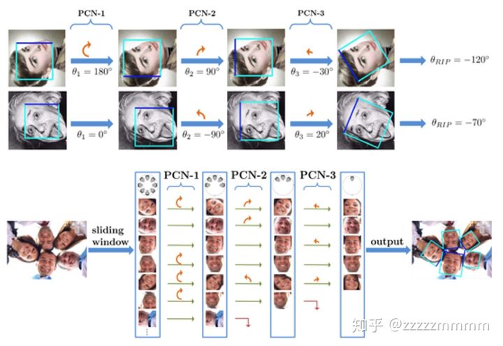 旋转人脸检测,利用自定义的PCN网络模型,每一次检测旋转角度、boundingbox、分类得分进行判断,通过级联的方式对boundingbox和分类进行过滤,旋转角度作为下一层的输入信息进行累加,从粗到精的一个过程,该文章之前已经见过一次在neurcomputting2017上发表的。