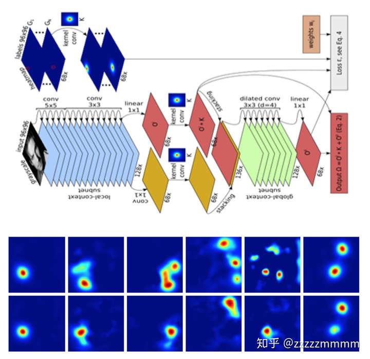 网络的设计思路特别,非常特别。下面在CVPR中的一篇论文Look at Boundary: A Boundary-Aware Face Alignment Algorithm具有相同的思路,都是利用heatmap作为引导进行神经网络的监督信号进行引导。不过这里需要preprocess进行热图的产生,即根据标记的数据和高斯模型产生heatmap,然后利用heatmap作为引导进行卷积神经网络的监督学习去逼近人脸关键点。
