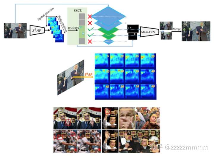 参考FCN和SSD网络模型,利用多层FCN特征层对大小不一的人脸进行检测,并且添加有SSCU算法层(基本原理是基于NMS非极大值抑制算法)作为FCN人脸热图判断,然后利用不同层检测的结果进行合并,对于背景中小人脸有较好的检测效果。文中并没有给出时间效率,并且SAP层的实现具有一定难度。