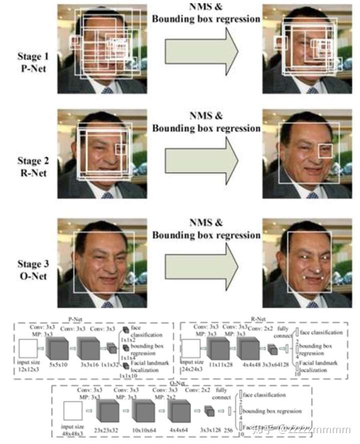 MTCNN 实现人脸检测和关键点定位分为三个阶段。首先由 P-Net 获得了人脸区域的候选窗口和边界框的回归向量,并用该边界框做回归,对候选窗口进行校准,然后通过非极大值抑制(NMS)来合并高度重叠的候选框。然后将 P-Net 得出的候选框作为输入,输入到 R-Net,R-Net 同样通过边界框回归和 NMS 来去掉那些 false-positive 区域,得到更为准确的候选框;最后,利用 O-Net 输出 5 个关键点的位置。