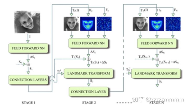 总而言之,DAN 是一个级联思想的关键点检测方法,通过引入关键点热图作为补充,DAN 可以从整张图片进行提取特征,从而获得更为精确的定位。
