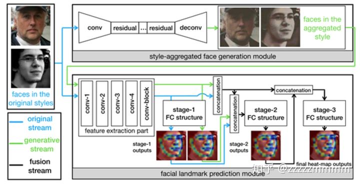 上面的style-aggregated face generation module就是使用GAN模型,具体下面的图会给出更加详细的解析。下面的facial landmark predicction module就是使用CNN网络模型。最后输出heatmap热图的位置点,通过高斯分布获得最佳预测位置。