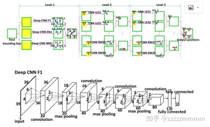 evel-1 分 3 个 CNN,分别是 F1(Face 1)、EN1(Eye,Nose)、NM1(Nose,Mouth);F1 输入尺寸为 39*39,输出 5 个关键点的坐标;EN1 输入尺寸为 39*31,输出是 3 个关键点的坐标;NM11 输入尺寸为 39*31,输出是 3 个关键点。Level-1 的输出是由三个 CNN 输出取平均得到。