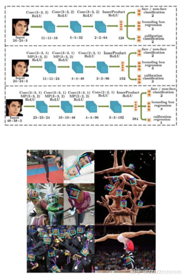 2016 年,Zhang 等人提出一种多任务级联卷积神经网络(MTCNN, Multi-task Cascaded Convolutional Networks)[9] 用以同时处理人脸检测和人脸关键点定位问题。作者认为人脸检测和人脸关键点检测两个任务之间往往存在着潜在的联系,然而大多数方法都未将两个任务有效的结合起来,本文为了充分利用两任务之间潜在的联系,提出一种多任务级联的人脸检测框架,将人脸检测和人脸关键点检测同时进行。