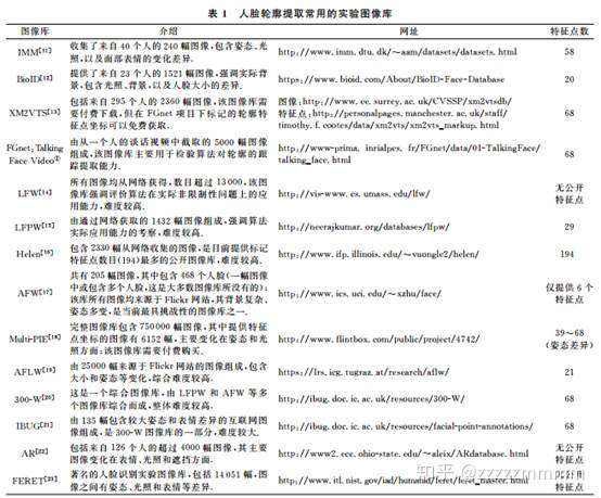 传统人脸关键点检测数据库为室内环境下采集的数据库,比如 Multi-pie、Feret、Frgc、AR、BioID 等人脸数据库。而现阶段人脸关键点检测数据库通常为复杂环境下采集的数据库.LFPW 人脸数据库有 1132 幅训练人脸图像和 300 幅测试人脸图像,大部分为正面人脸图像,每个人脸标定 29 个关键点。AFLW 人脸数据库包含 25993 幅从 Flickr 采集的人脸图像,每个人脸标定 21 个关键点。COFW 人脸数据库包含 LFPW 人脸数据库训练集中的 845 幅人脸图像以及其他 500 幅遮挡人脸图像,而测试集为 507 幅严重遮挡(同时包含姿态和表情的变化)的人脸图像,每个人脸标定 29 个关键点。MVFW 人脸数据库为多视角人脸数据集,包括 2050 幅训练人脸图像和 450 幅测试人脸图像,每个人脸标定 68 个关键点。OCFW 人脸数据库包含 2951 幅训练人脸图像(均为未遮挡人脸)和 1246 幅测试人脸图像(均为遮挡人脸),每个人脸标定 68 个关键点。