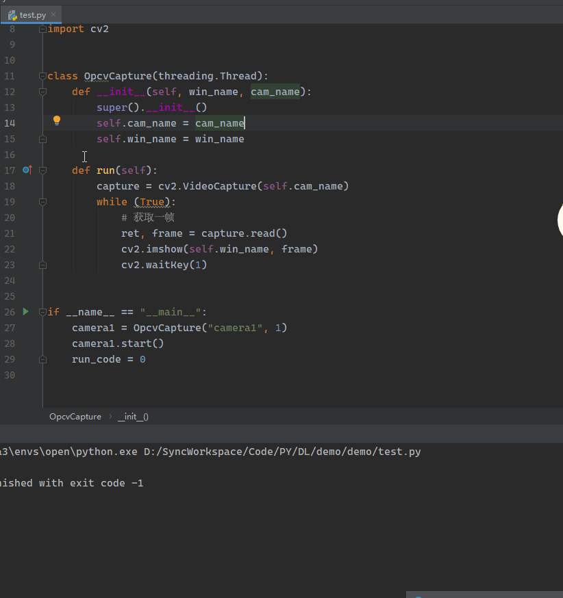 import threadingimport cv2 class OpcvCapture(threading.Thread): def __init__(self, win_name, cam_name): super().__init__() self.cam_name = cam_name self.win_name = win_name def run(self): capture = cv2.VideoCapture(self.cam_name) while (True): # 获取一帧 ret, frame = capture.read() cv2.imshow(self.win_name, frame) cv2.waitKey(1) if __name__ == "__main__": camera1 = OpcvCapture("camera1", 1) camera1.start() run_code = 0
