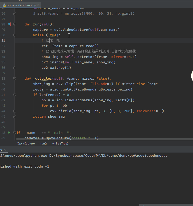 #摄像头实时画面线程类的部分代码 def run(self): capture = cv2.VideoCapture(self.cam_name) while (True): # 获取一帧 ret, frame = capture.read() # 获取的帧送入检测,绘制检测结果后返回,自拍模式做镜像 show_img = self._detector(frame, mirror=True) cv2.imshow(self.win_name, show_img) cv2.waitKey(1)