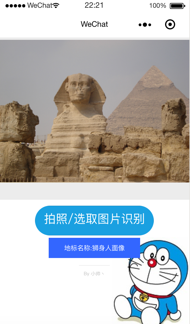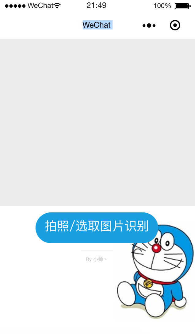 }拍照或选择图片识别 那我们就需要一个按钮来调起相册或相机选取图片文件。为了能让用户看到自己选择或拍的照片。那我们还需要一个图片组件 按钮组件文档 https://developers.weixin.qq.com/miniprogram/dev/component/button.html 选取图片文件API文档 https://developers.weixin.qq.com/miniprogram/dev/api/wx.chooseImage.html 图片组件文档 https://developers.weixin.qq.com/miniprogram/dev/component/image.html 具体使用说明看官方即可,小帅这里就不废话了