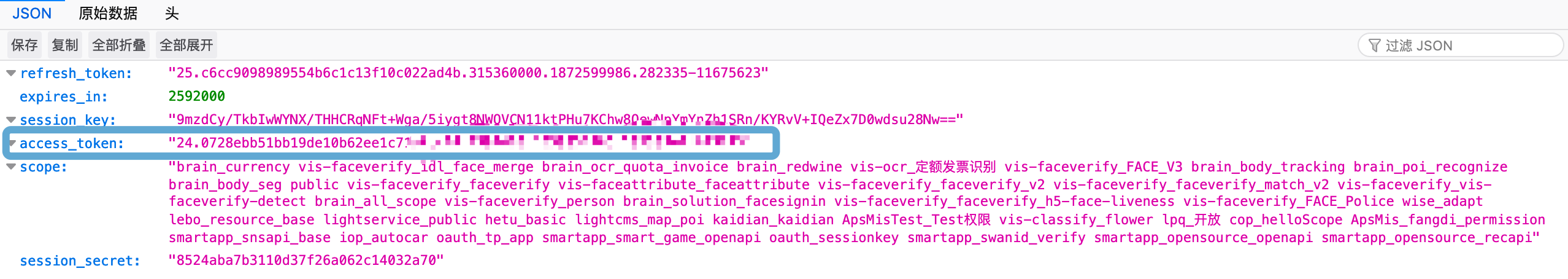https://aip.baidubce.com/oauth/2.0/token?grant_type=client_credentials&client_id=API_KEY&client_secret=SERCET_KEY 结果如下图。大家要注意哦。只是拿access_token后面对应的值哦。并不是第一行的值哦。 获取access_token的值保存。后续会用到