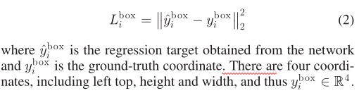 通过欧式距离来计算回归损失,其中y为一个(左上角x,左上角y,长,宽)组成的四 元组 ,y_hat表示网络预测值,y表示真实边框的坐标。