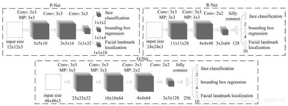 stage3)Output Network (O-Net):该层在R-Net的基础上多了一层卷积层,所以处理的结果会更加精细。作用和R-Net层作用一样。输入的是R-net输出的bounding box,大小调整为48*48,输出包含P个bounding box的4个坐标信息、score和关键点(landmark)信息。