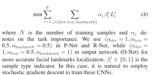 表示样本标签(在于标记非人脸的输入,只需要计算分类损失)。可见在P-Net和R-Net中,关键点的损失权重(α)要小于O-Net部分,这是因为前两个极端重点在于过滤掉非人脸的bbox。