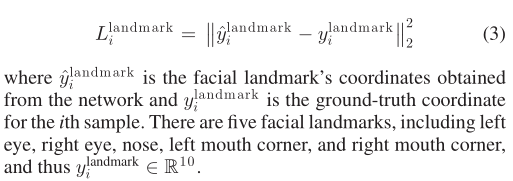 和边框坐标回归一样,计算网络预测的特征点位置和实际真实特征点位置的欧式距离,并最小化该距离。其中y_hat为通过网络预测得到,y为实际的真实的特征点坐标。一个有五个特征点,所以y属于十元组。