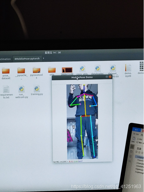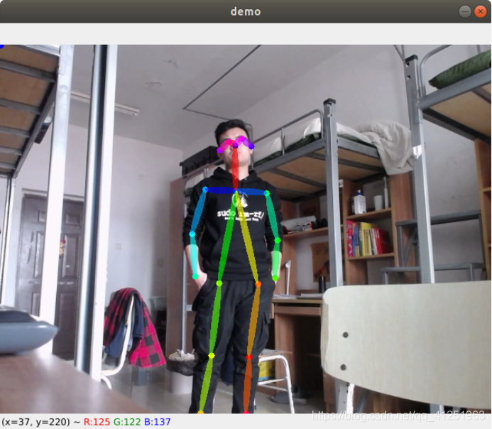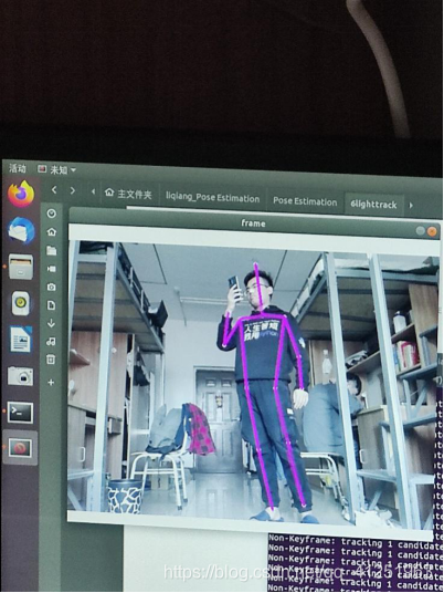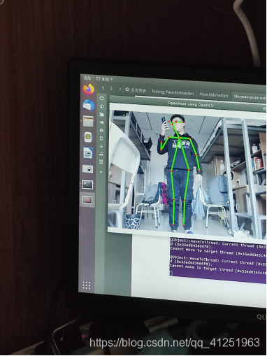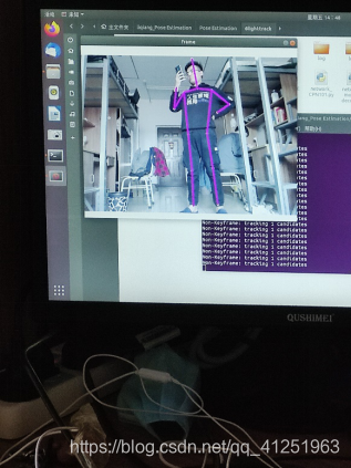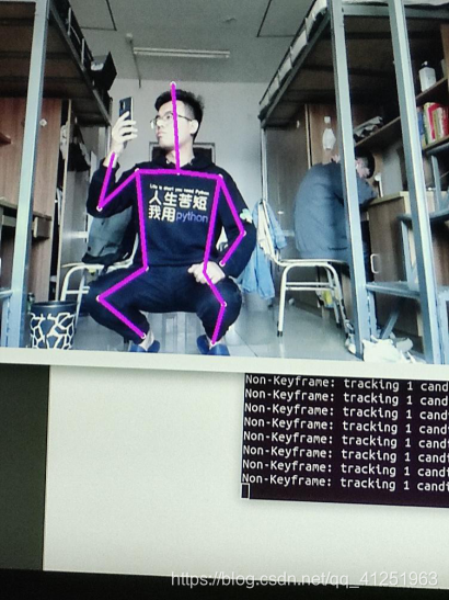 然后官方是直接对摄像头进行裁剪,只有中间一部分,(放得下一个人的位置)。而且即使没有框住人,也会生成骨架信息。例如下图,直到窗口有人出现才把骨架和人对上。