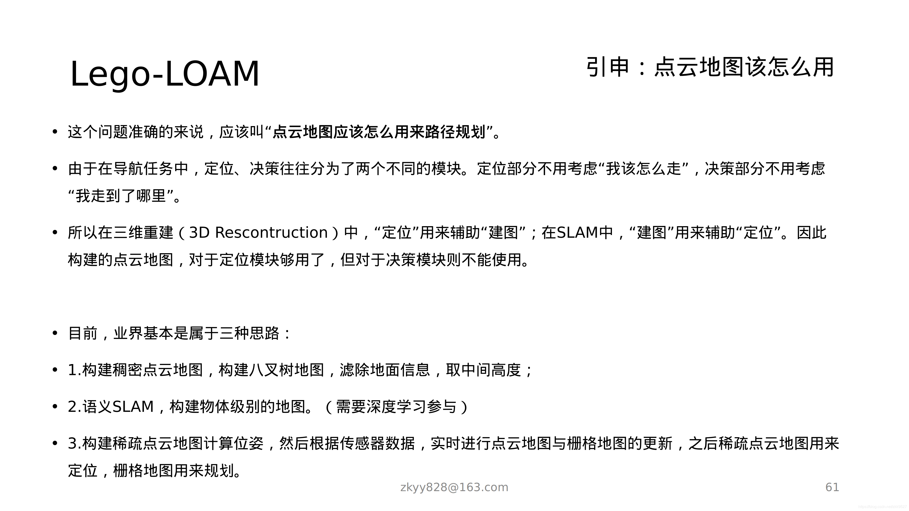 目前,业界基本是属于三种思路: 1.构建稠密点云地图,构建八叉树地图,滤除地面信息,取中间高度; 2.语义SLAM,构建物体级别的地图。(需要深度学习参与) 3.构建稀疏点云地图计算位姿,然后根据传感器数据,实时进行点云地图与栅格地图的更新,之后稀疏点云地图用来定位,栅格地图用来规划。