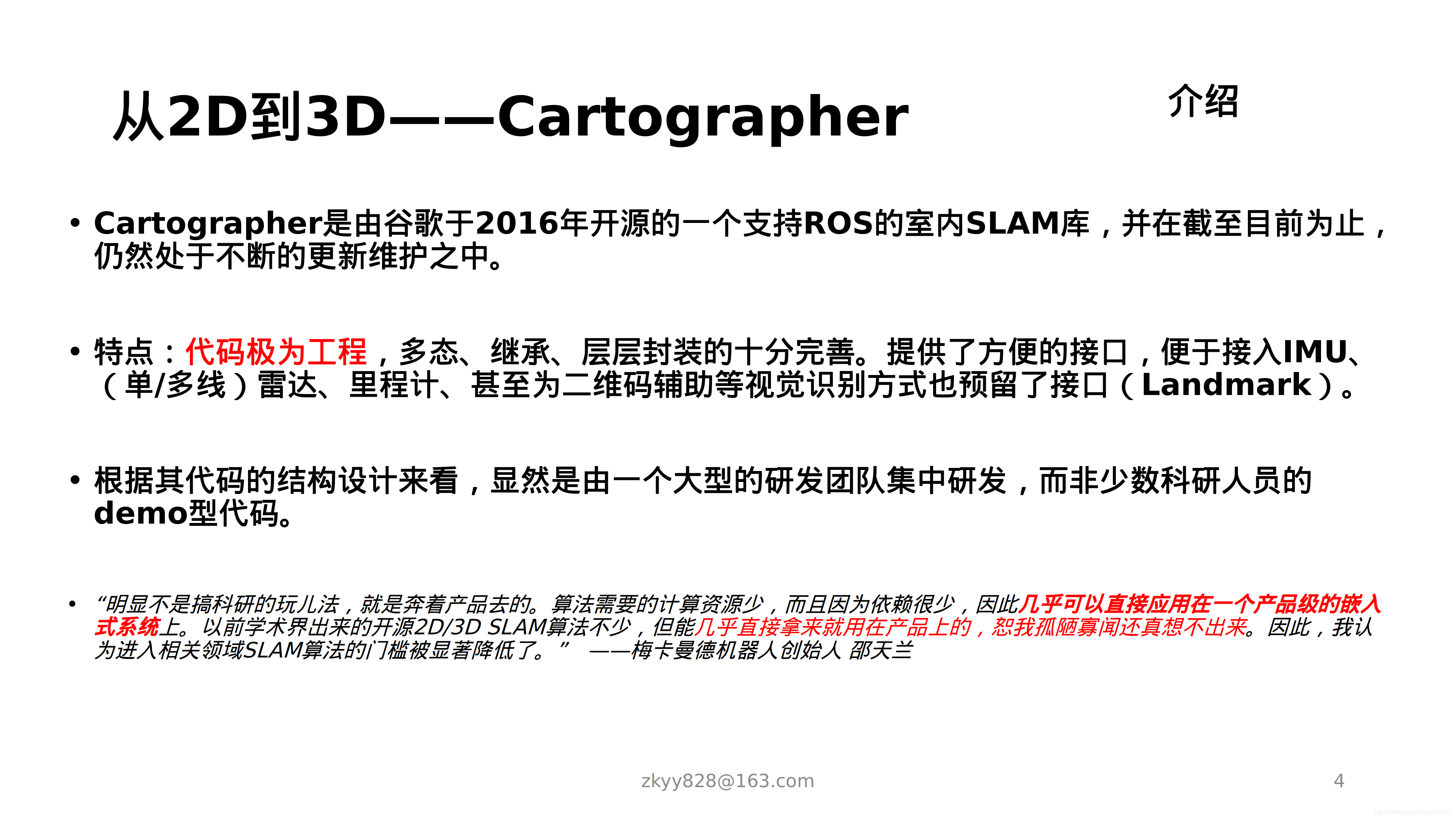 “明显不是搞科研的玩儿法,就是奔着产品去的。算法需要的计算资源少,而且因为依赖很少,因此几乎可以直接应用在一个产品级的嵌入式系统上。以前学术界出来的开源2D/3D SLAM算法不少,但能几乎直接拿来就用在产品上的,恕我孤陋寡闻还真想不出来。因此,我认为进入相关领域SLAM算法的门槛被显著降低了。” ——知乎 梅卡曼德机器人创始人 邵天兰