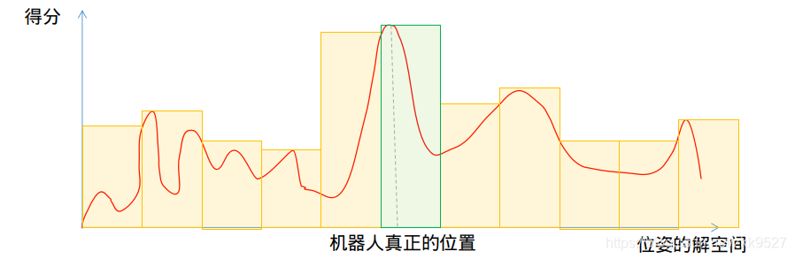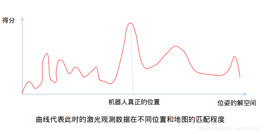2.机器人真正的位置处,激光和地图匹配得分最高;