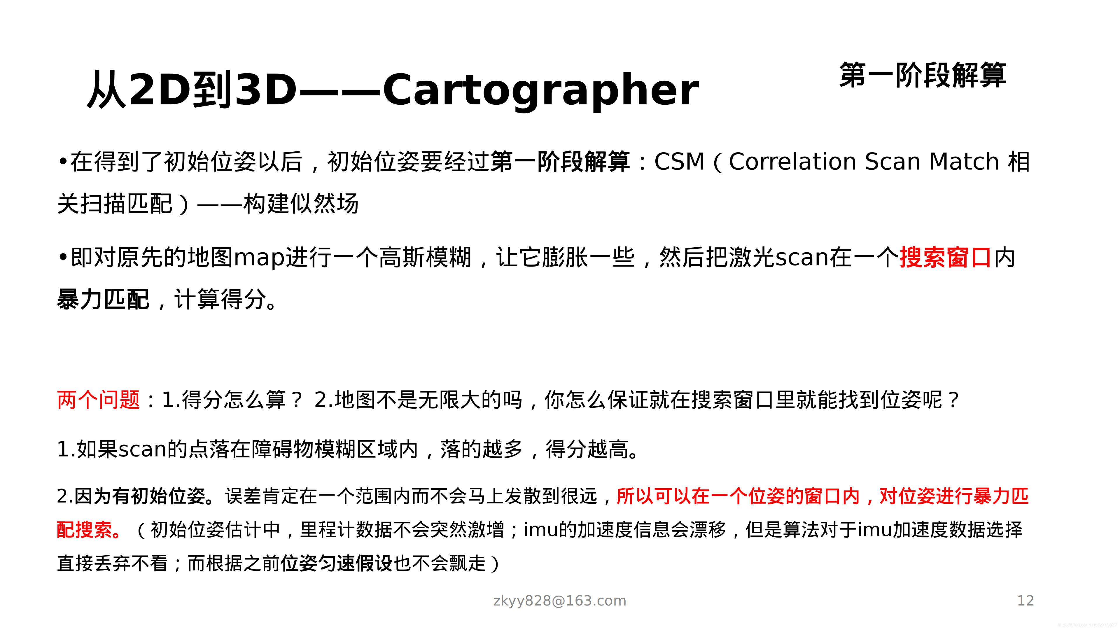 注意,这里有两个问题: 1.得分怎么算? 如果scan的点落在障碍物模糊区域内,落的越多,得分越高。 2.地图不是无限大的吗,你怎么保证在搜索窗口里就能找到位姿呢? 因为有初始位姿。误差肯定在一个范围内而不会马上发散到很远,所以可以在一个位姿的窗口内,对位姿进行暴力匹配搜索。(初始位姿估计中,里程计数据不会突然激增;imu的加速度信息会漂移,但是算法对于imu加速度数据选择直接丢弃不看;而根据之前位姿匀速假设也不会飘走)