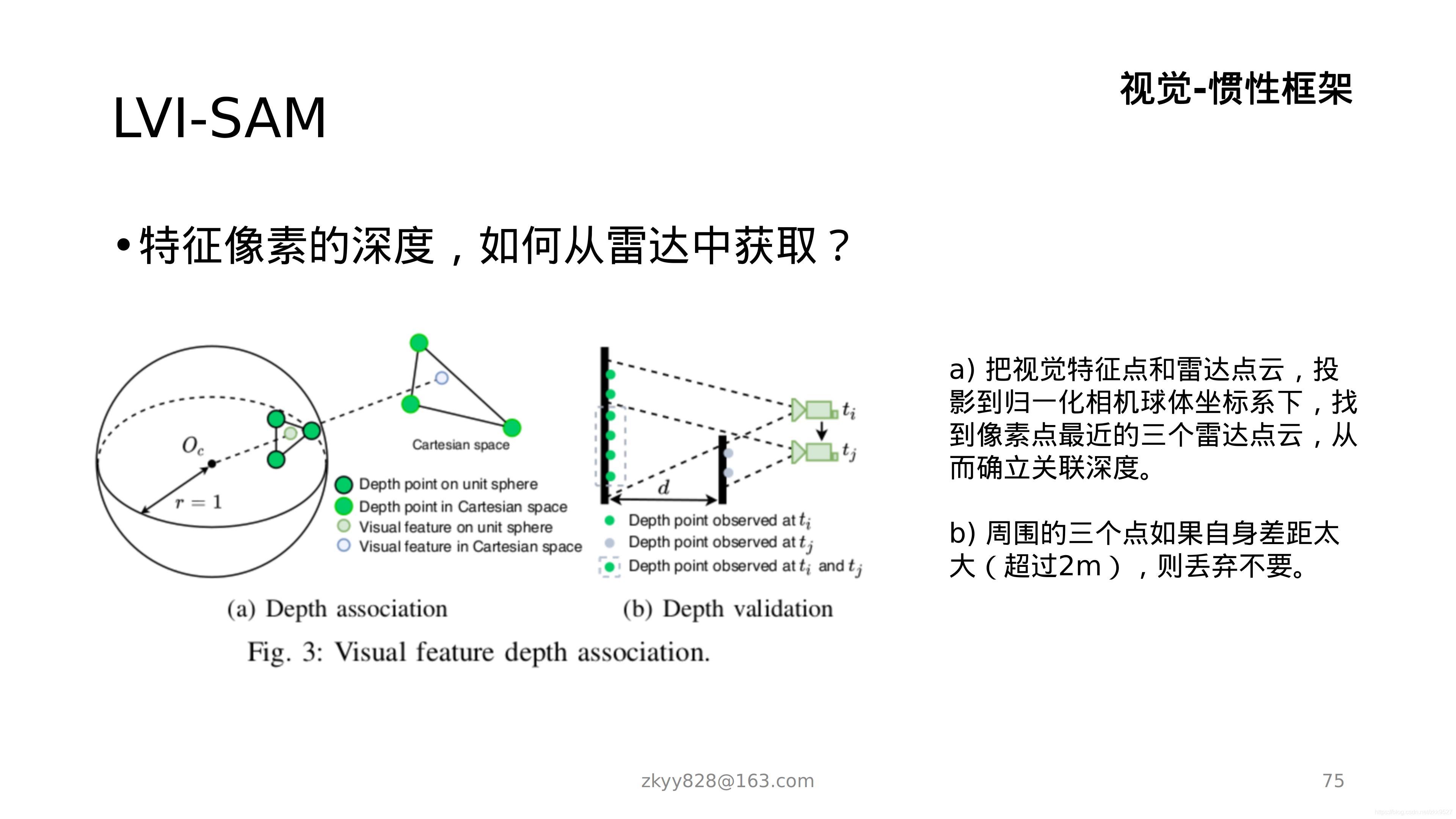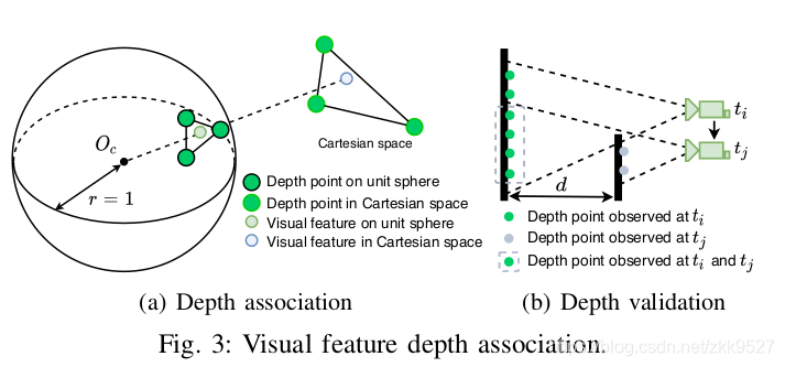 a) 把视觉特征点和雷达点云,投影到归一化相机球体坐标系下,找到像素点最近的三个雷达点云,从而确立关联深度。 b) 周围的三个点如果自身差距太大(超过2m),则丢弃不要。