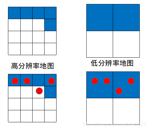 左图四个命中3个,得分75; 右图四个命中2个,得分50; 那么激光打在子区域A的可能性就要大于B,因此B就无需继续展开成更精细的地图了。