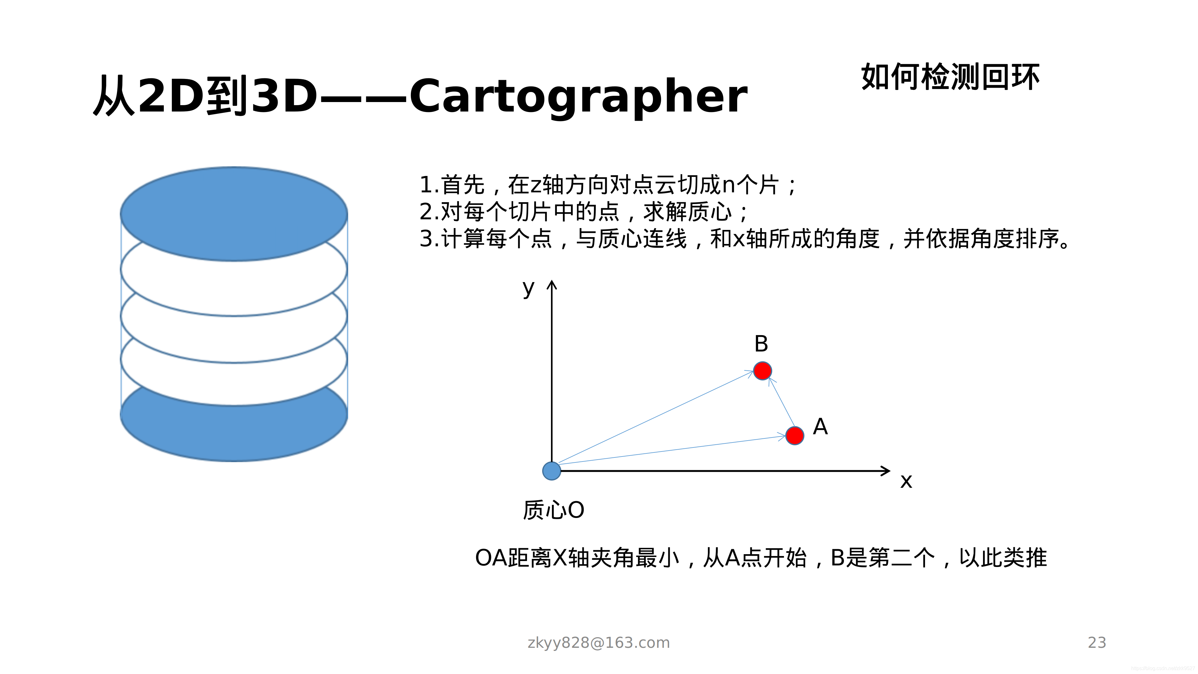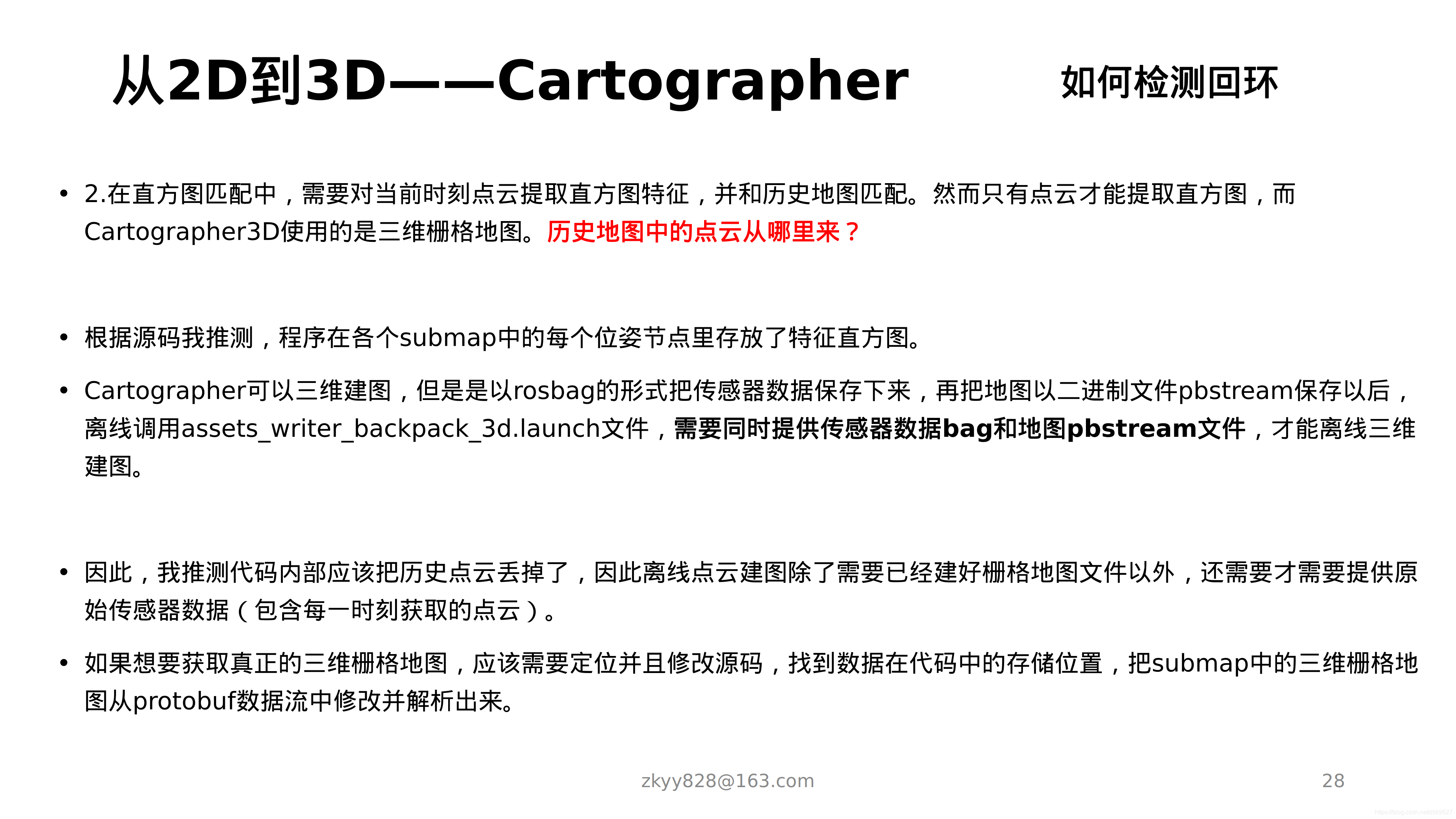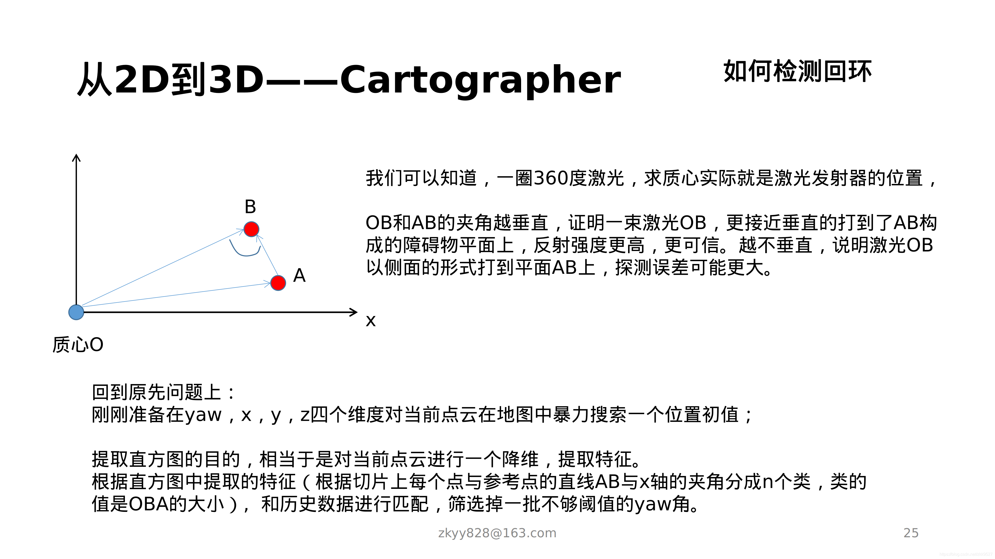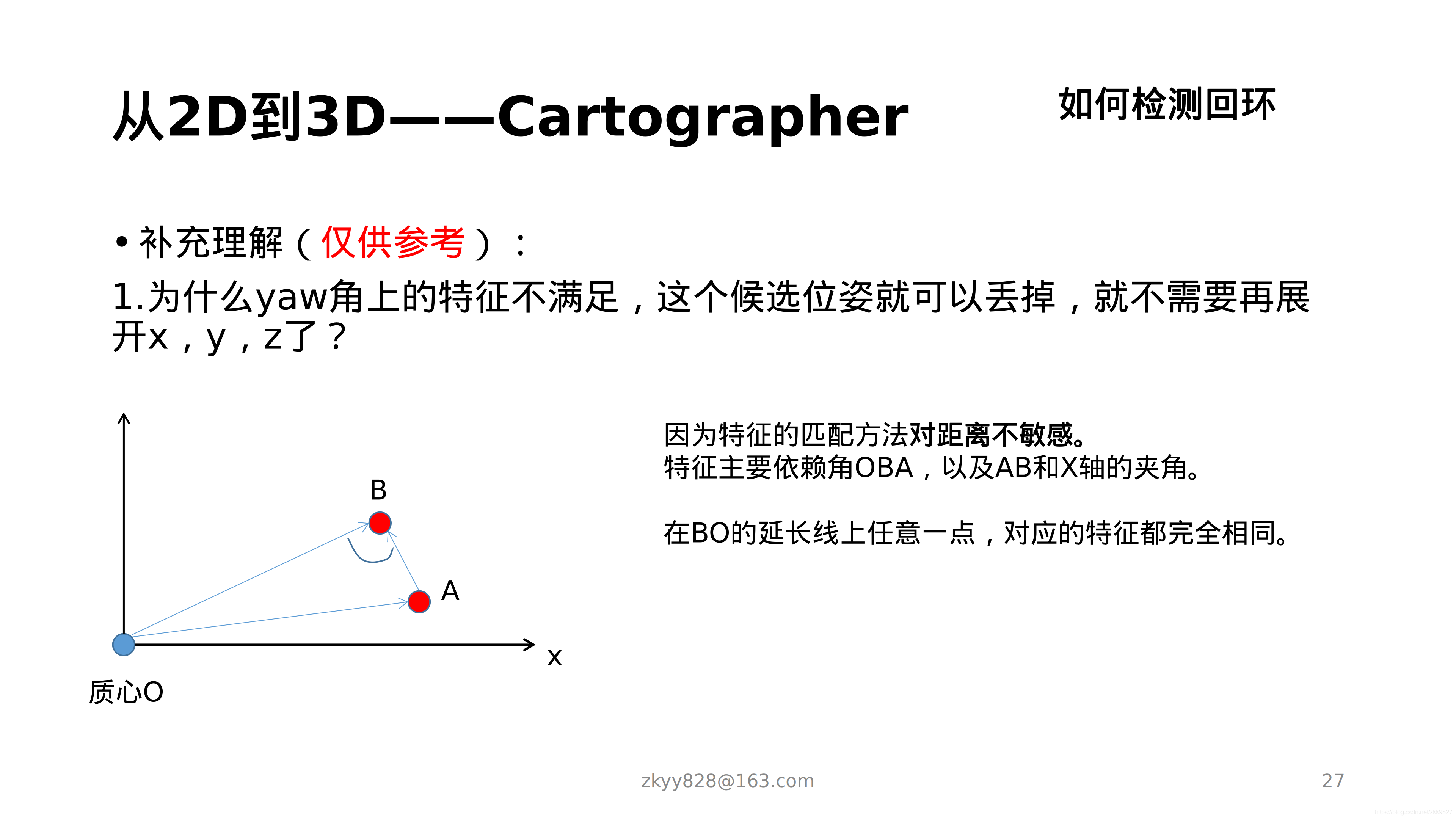 补充理解(仅供参考): 1.为什么yaw角上的特征不满足,这个候选位姿就可以丢掉,就不需要再展开x,y,z了? 因为特征的匹配方法对距离不敏感。 特征主要依赖角OBA,以及AB和X轴的夹角。 在BO的延长线上任意一点,对应的特征都完全相同。 2.在直方图匹配中,需要对当前时刻点云提取直方图特征,并和历史地图匹配。然而只有点云才能提取直方图,而Cartographer3D使用的是三维栅格地图。历史地图中的点云从哪里来? 根据源码我推测,程序在各个submap中的每个位姿节点里存放了特征直方图。 Cartographer可以三维建图,但是是以rosbag的形式把传感器数据保存下来,再把地图以二进制文件pbstream保存以后,离线调用assets_writer_backpack_3d.launch文件,需要同时提供传感器数据bag和地图pbstream文件,才能离线三维建图。 (关于这点,详见SLAM学习笔记(十八)3D激光SLAM——Cartographer第一视角点云可视化配置与使用方法(最新) ) 因此,我推测代码内部应该把历史点云丢掉了,因此离线点云建图除了需要已经建好栅格地图文件以外,还需要才需要提供原始传感器数据(包含每一时刻获取的点云)。 如果想要获取真正的三维栅格地图,应该需要定位并且修改源码,找到数据在代码中的存储位置,把submap中的三维栅格地图从protobuf数据流中修改并解析出来。