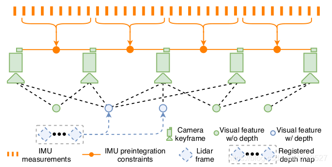 2.特征像素的深度,从雷达数据中获取;(vins-mono是通过三角测量计算,不够准确)