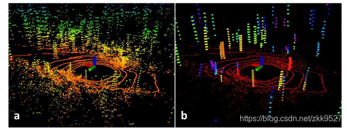 因此,每个点都是基于不同时间戳的。如果本身雷达自身处于运动状态,就会导致运动畸变。 算法采取了两种方式:线性插值和分段处理。