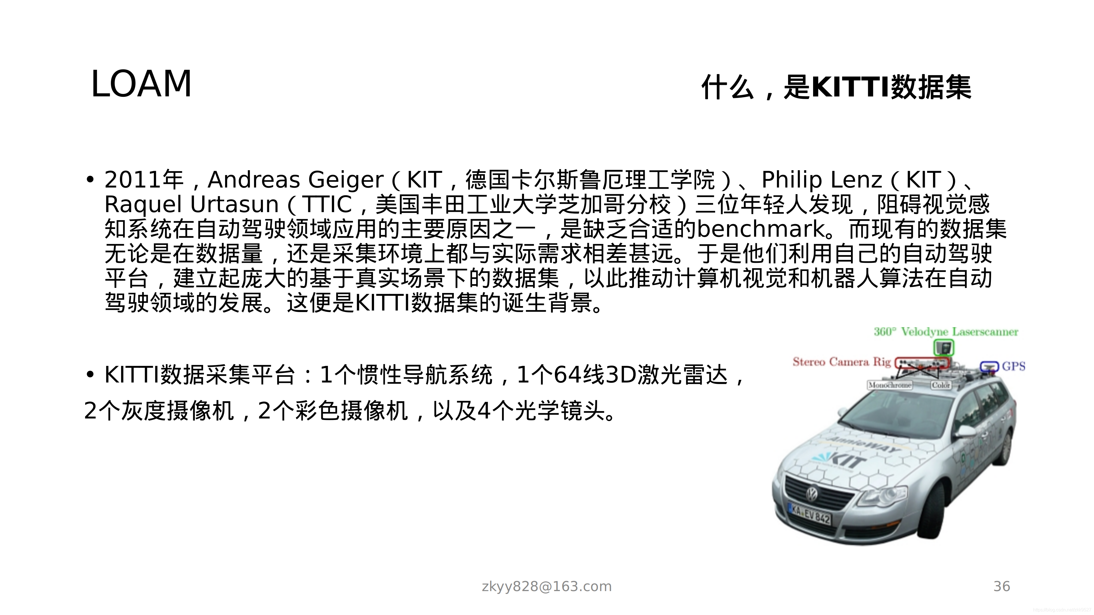 2011年,Andreas Geiger(KIT,德国卡尔斯鲁厄理工学院)、Philip Lenz(KIT)、Raquel Urtasun(TTIC,美国丰田工业大学芝加哥分校)三位年轻人发现,阻碍视觉感知系统在自动驾驶领域应用的主要原因之一,是缺乏合适的benchmark。而现有的数据集无论是在数据量,还是采集环境上都与实际需求相差甚远。于是他们利用自己的自动驾驶平台,建立起庞大的基于真实场景下的数据集,以此推动计算机视觉和机器人算法在自动驾驶领域的发展。这便是KITTI数据集的诞生背景。