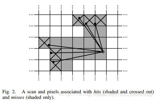 以方格代表地图块,内部存储数据用来表示被占据的概率。 发出一束激光,打到一个障碍物点,被打到的称为hit点,中间连线上的空区域,称为miss点。 2d和3d都是存储的这样的地图。3d相当于是3维的栅格地图。