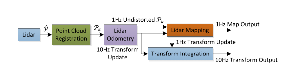 Lidar Mapping: 建图模块,把连续10帧的点云数据和整个地图匹配,获得世界坐标系下的位姿,频率较低 1Hz。