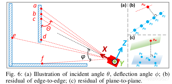 我们可以知道,一圈360度激光,求质心实际就是激光发射器的位置, OB和AB的夹角越垂直,证明一束激光OB,更接近垂直的打到了AB构成的障碍物平面上,反射强度更高,更可信。越不垂直,说明激光OB以侧面的形式打到平面AB上,探测误差可能更大。