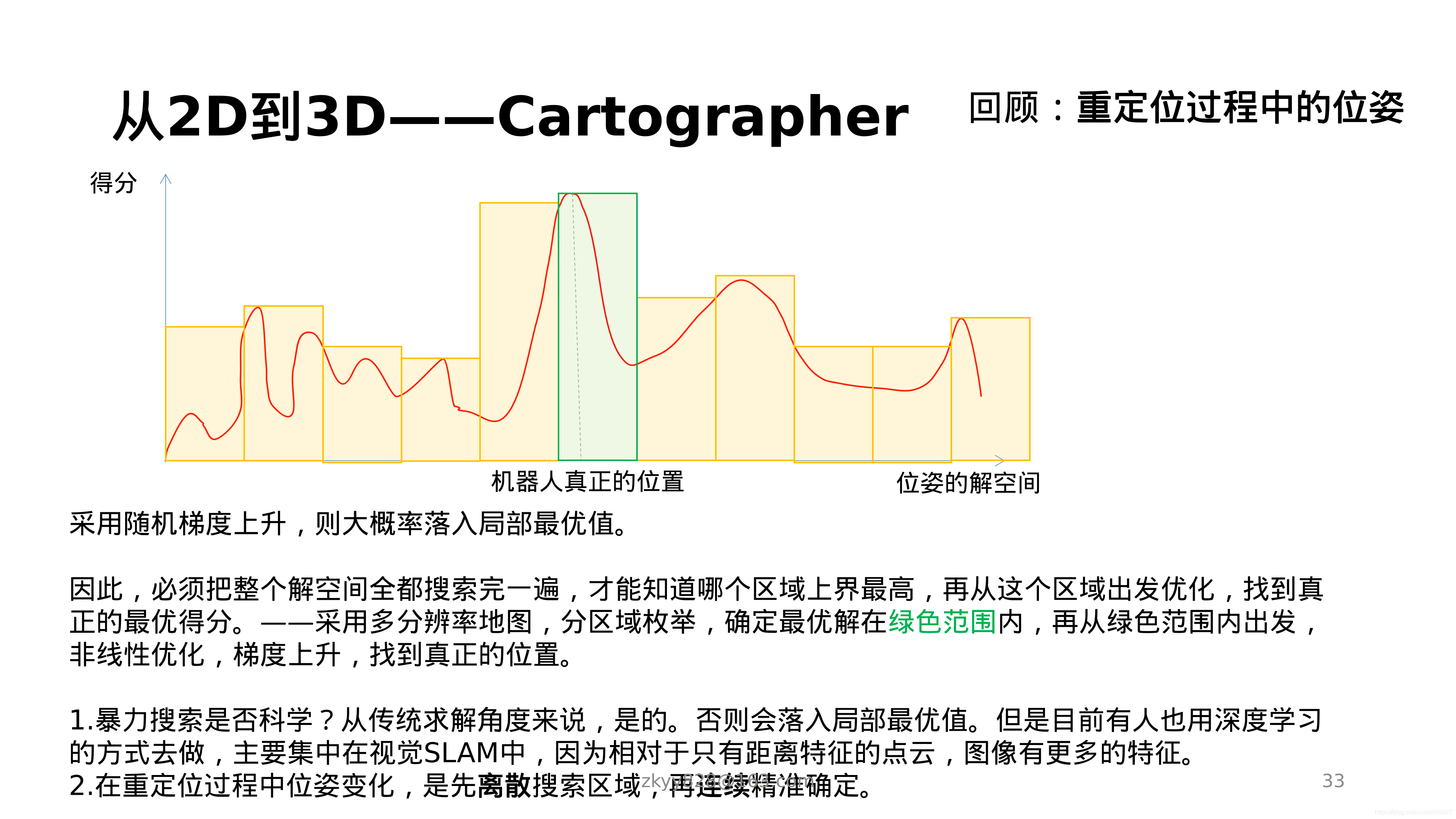 因此,必须把整个解空间全都搜索完一遍,才能知道哪个区域上界最高,再从这个区域出发优化,找到真正的最优得分。——采用多分辨率地图,分区域枚举,确定最优解在绿色范围内,再从绿色范围内出发,非线性优化,梯度上升,找到真正的位置。