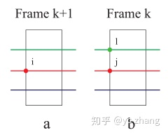 红、绿、蓝代表多线激光雷达的扫描线; 在第k+1帧中,边缘点i处在红色的扫瞄线上;
